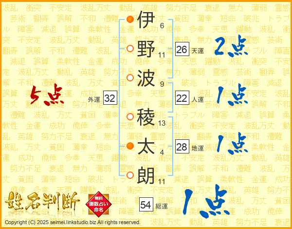 伊(6画)野(11画)波(9画) 稜(13画)太(4画)朗(11画)