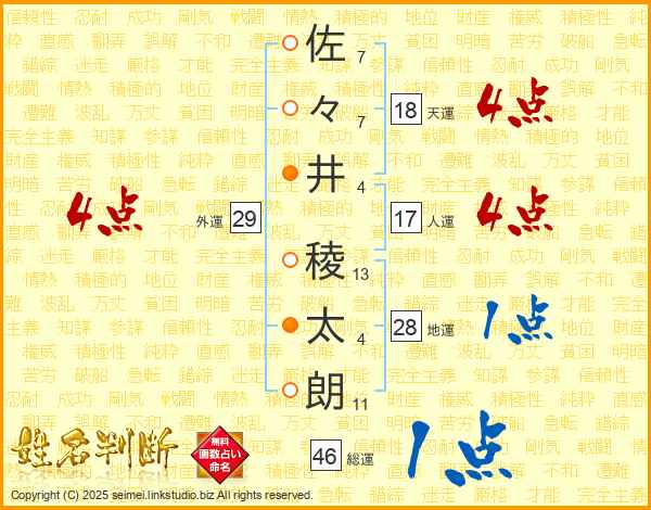 佐(7画)々(7画)井(4画) 稜(13画)太(4画)朗(11画)