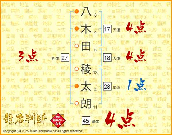 八(8画)木(4画)田(5画) 稜(13画)太(4画)朗(11画)