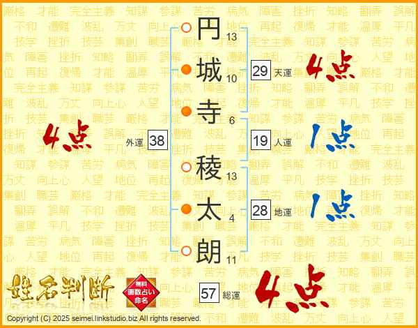 円(13画)城(10画)寺(6画) 稜(13画)太(4画)朗(11画)