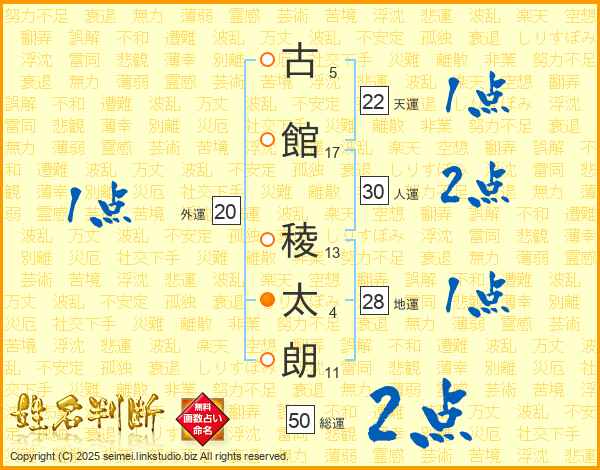 古(5画)館(17画) 稜(13画)太(4画)朗(11画)
