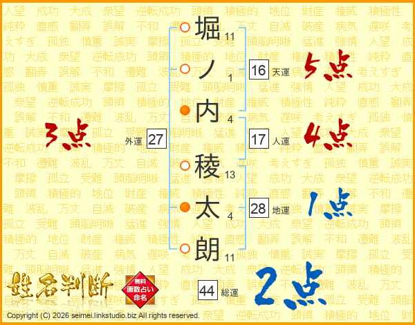 堀(11画)ノ(1画)内(4画) 稜(13画)太(4画)朗(11画)