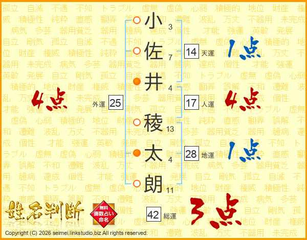 小(3画)佐(7画)井(4画) 稜(13画)太(4画)朗(11画)