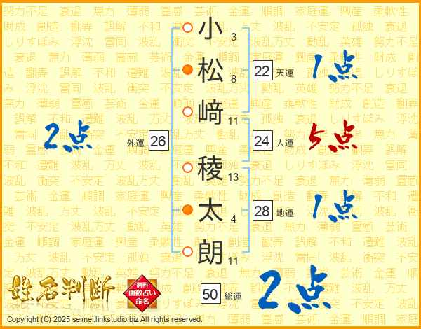 小(3画)松(8画)﨑(11画) 稜(13画)太(4画)朗(11画)