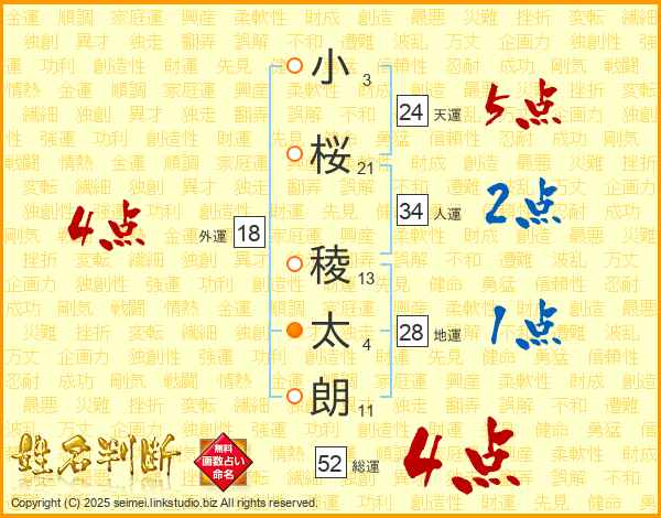 小(3画)桜(21画) 稜(13画)太(4画)朗(11画)
