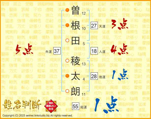 曽(12画)根(10画)田(5画) 稜(13画)太(4画)朗(11画)