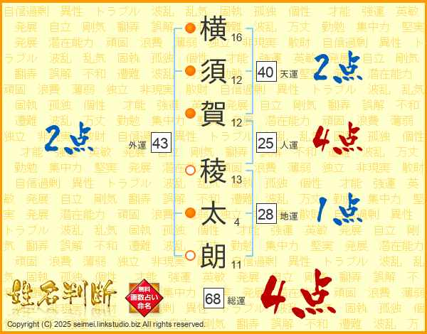 横(16画)須(12画)賀(12画) 稜(13画)太(4画)朗(11画)