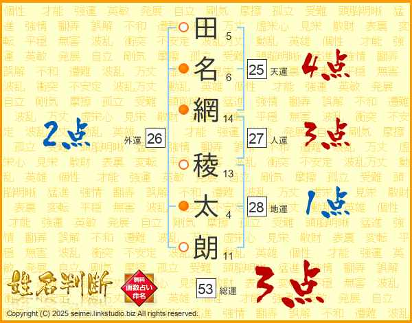 田(5画)名(6画)網(14画) 稜(13画)太(4画)朗(11画)