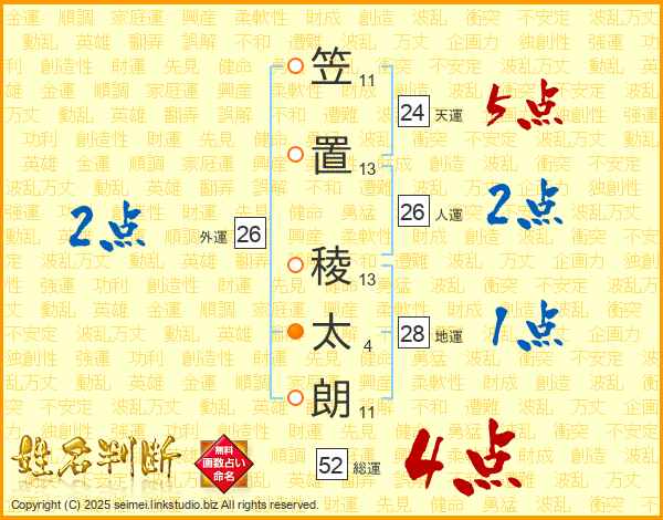 笠(11画)置(13画) 稜(13画)太(4画)朗(11画)