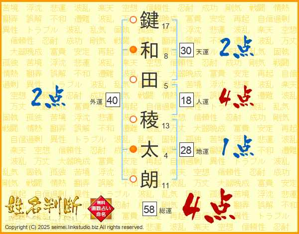 鍵(17画)和(8画)田(5画) 稜(13画)太(4画)朗(11画)