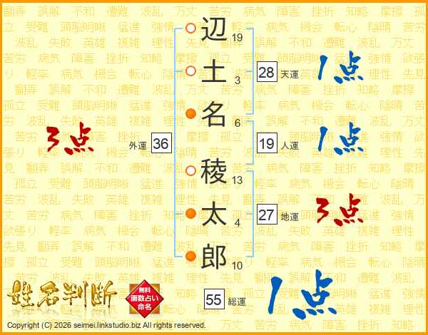 辺(19画)土(3画)名(6画) 稜(13画)太(4画)郎(10画)