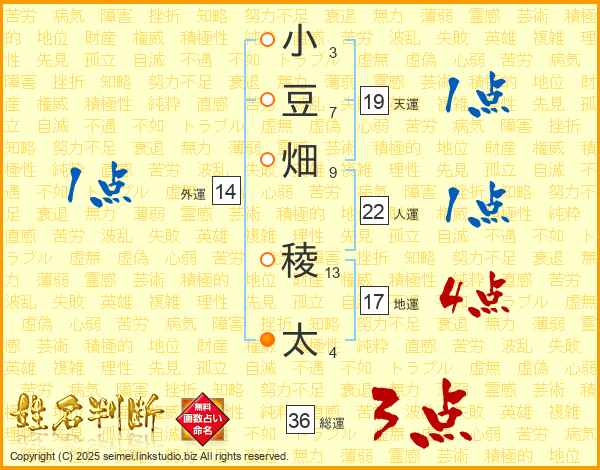 小(3画)豆(7画)畑(9画) 稜(13画)太(4画)