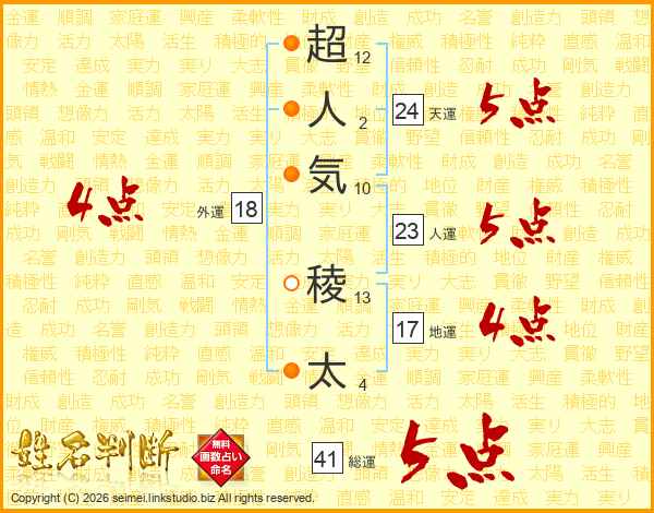 超(12画)人(2画)気(10画) 稜(13画)太(4画)