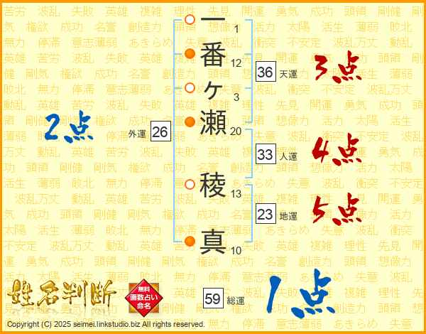 一番ヶ瀬稜真さんの総運は59画の1点!