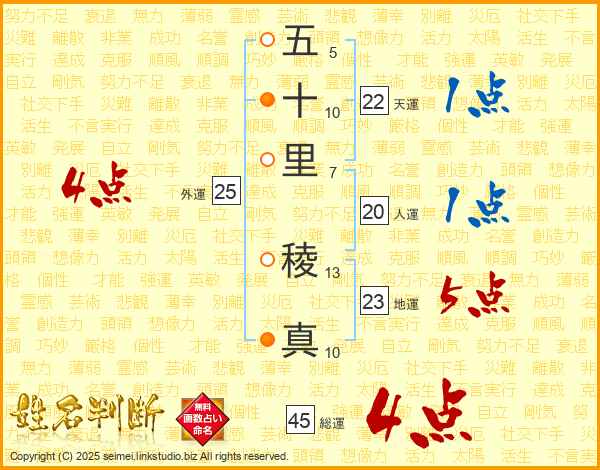 生活面を象徴する運勢です。外部から受ける影響力を表し、結婚運、家庭運や職場、環境への順応性を表します。総運から人運を引いた画数。姓や名が1文字の場合を除く。