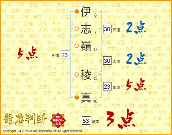 伊(6画)志(7画)嶺(17画) 稜(13画)真(10画)