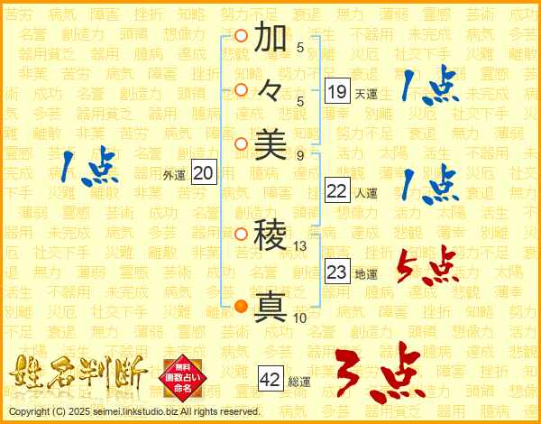 加(5画)々(5画)美(9画) 稜(13画)真(10画)
