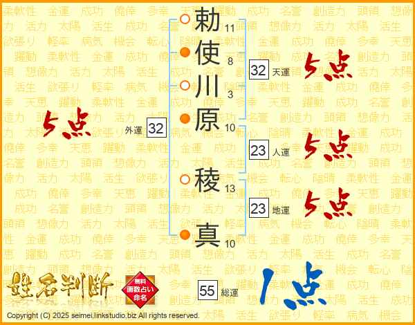 勅(11画)使(8画)川(3画)原(10画) 稜(13画)真(10画)