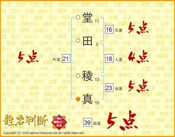生活面を象徴する運勢です。外部から受ける影響力を表し、結婚運、家庭運や職場、環境への順応性を表します。総運から人運を引いた画数。姓や名が1文字の場合を除く。