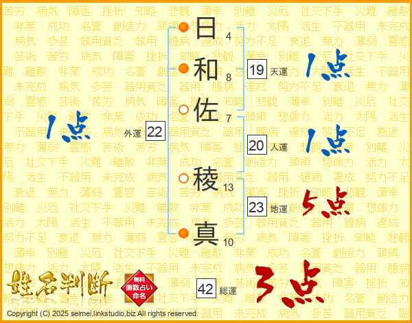 日(4画)和(8画)佐(7画) 稜(13画)真(10画)