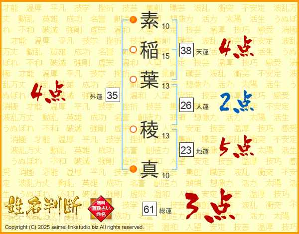 素(10画)稲(15画)葉(13画) 稜(13画)真(10画)