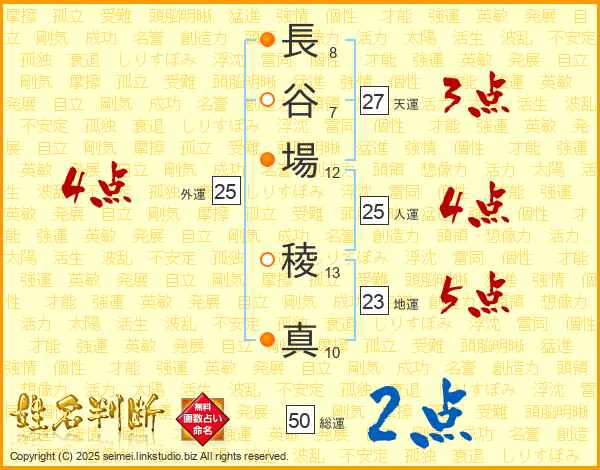 長(8画)谷(7画)場(12画) 稜(13画)真(10画)