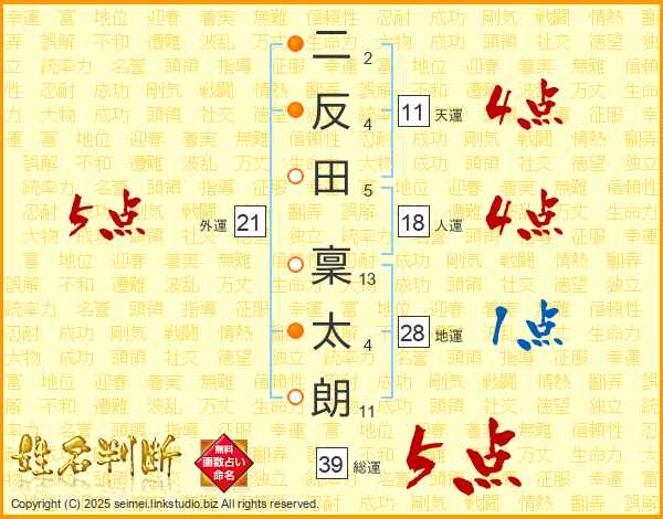 あなたの人生を表す1番重要な運勢です。生涯を通じて影響する総合運となり、主に50歳以降の晩年期に影響を及ぼします。苗字と名前の合計画数。