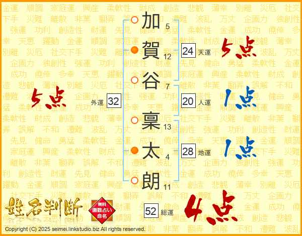 加(5画)賀(12画)谷(7画) 稟(13画)太(4画)朗(11画)