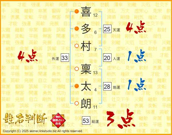 喜(12画)多(6画)村(7画) 稟(13画)太(4画)朗(11画)