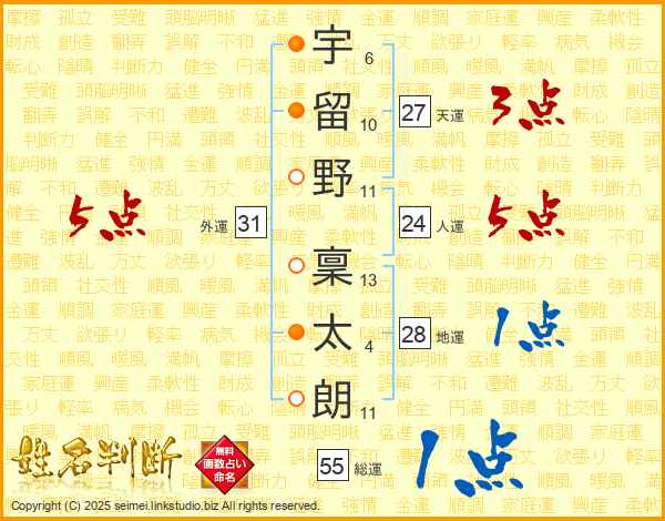 宇(6画)留(10画)野(11画) 稟(13画)太(4画)朗(11画)