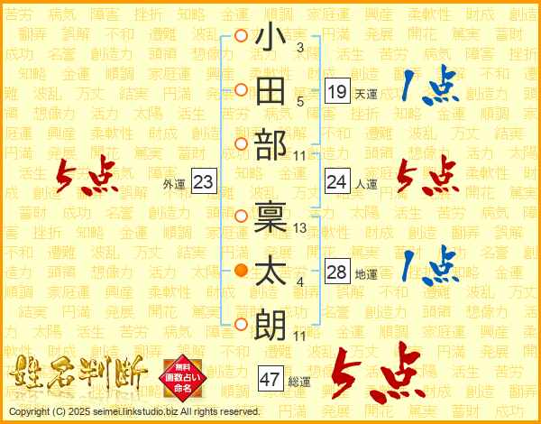 小(3画)田(5画)部(11画) 稟(13画)太(4画)朗(11画)