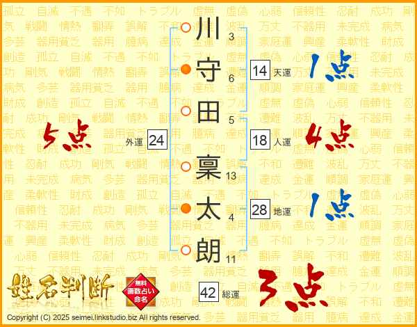 川(3画)守(6画)田(5画) 稟(13画)太(4画)朗(11画)