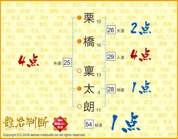 栗(10画)橋(16画) 稟(13画)太(4画)朗(11画)