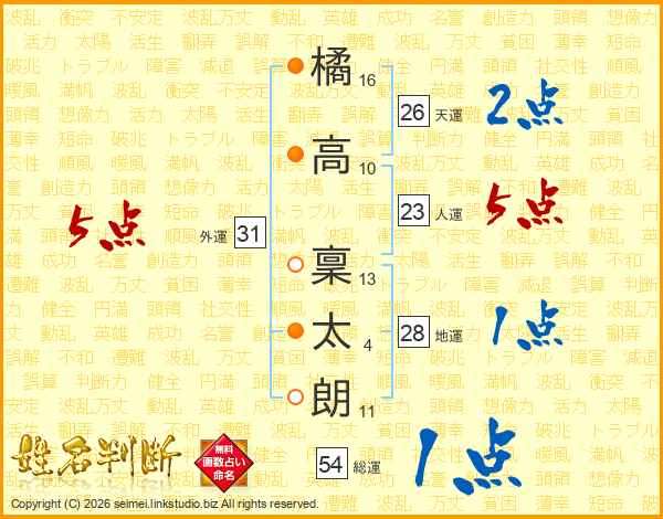橘(16画)高(10画) 稟(13画)太(4画)朗(11画)