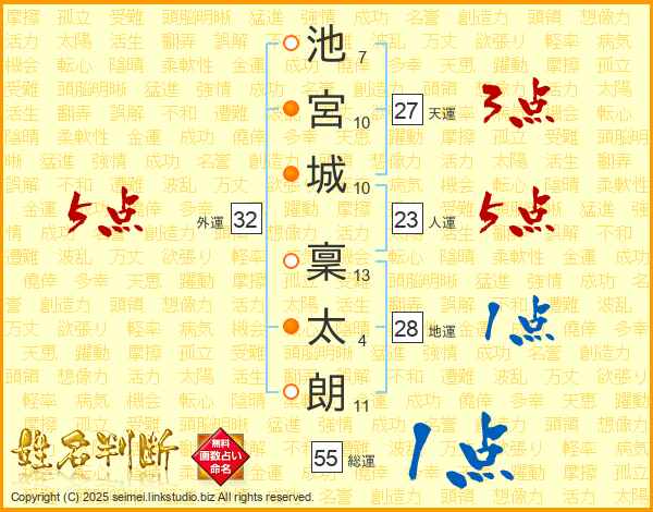 池(7画)宮(10画)城(10画) 稟(13画)太(4画)朗(11画)