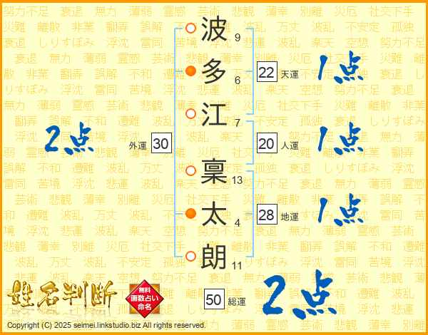 波(9画)多(6画)江(7画) 稟(13画)太(4画)朗(11画)