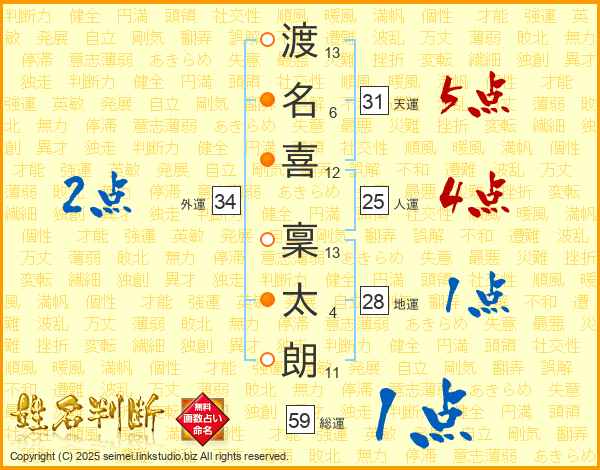 渡(13画)名(6画)喜(12画) 稟(13画)太(4画)朗(11画)