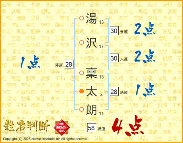 湯(13画)沢(17画) 稟(13画)太(4画)朗(11画)