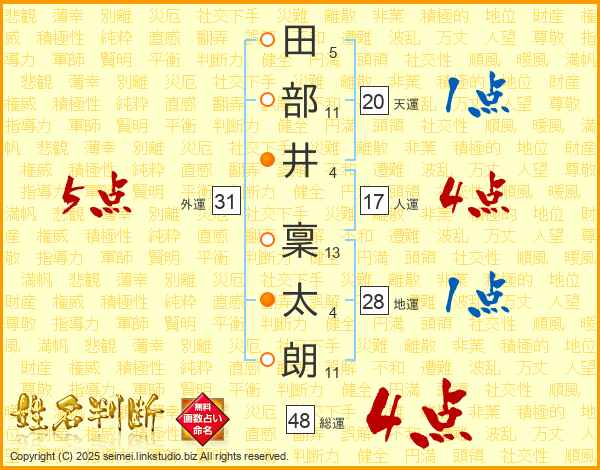 田(5画)部(11画)井(4画) 稟(13画)太(4画)朗(11画)
