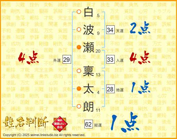 白(5画)波(9画)瀬(20画) 稟(13画)太(4画)朗(11画)