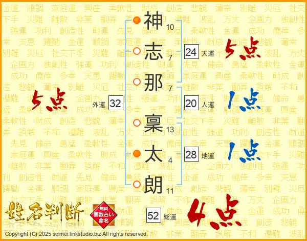 神(10画)志(7画)那(7画) 稟(13画)太(4画)朗(11画)