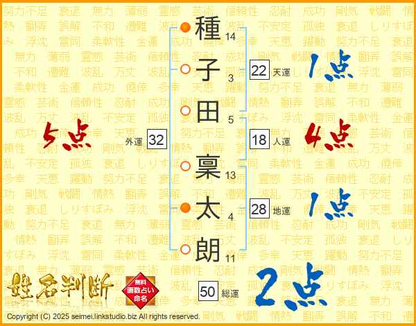 種(14画)子(3画)田(5画) 稟(13画)太(4画)朗(11画)