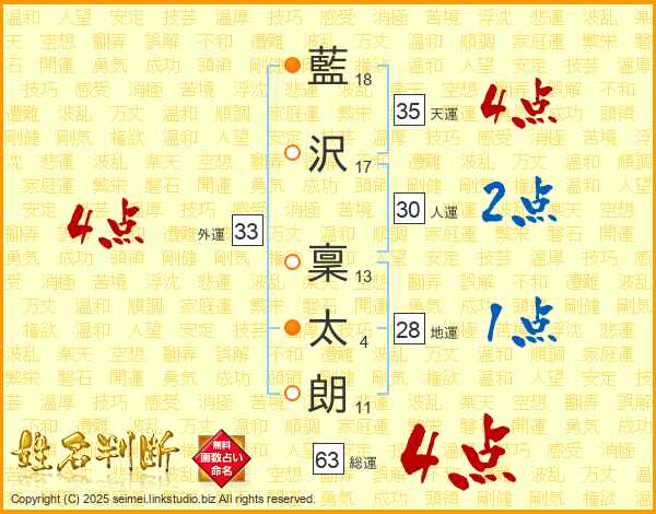 藍(18画)沢(17画) 稟(13画)太(4画)朗(11画)