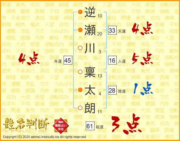 逆(10画)瀬(20画)川(3画) 稟(13画)太(4画)朗(11画)