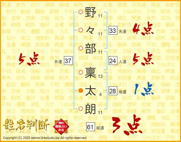 野(11画)々(11画)部(11画) 稟(13画)太(4画)朗(11画)