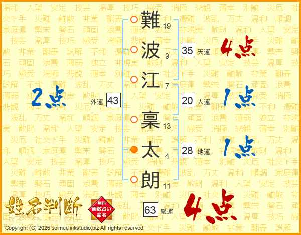 難(19画)波(9画)江(7画) 稟(13画)太(4画)朗(11画)