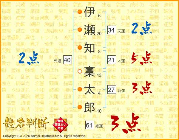 伊(6画)瀬(20画)知(8画) 稟(13画)太(4画)郎(10画)