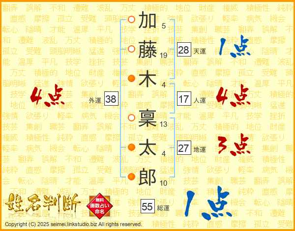 加(5画)藤(19画)木(4画) 稟(13画)太(4画)郎(10画)