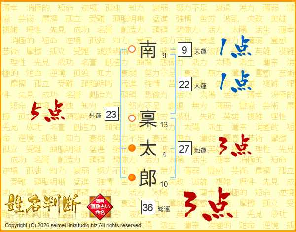 あなたの人生を表す1番重要な運勢です。生涯を通じて影響する総合運となり、主に50歳以降の晩年期に影響を及ぼします。苗字と名前の合計画数。