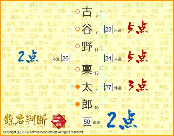 古(5画)谷(7画)野(11画) 稟(13画)太(4画)郎(10画)